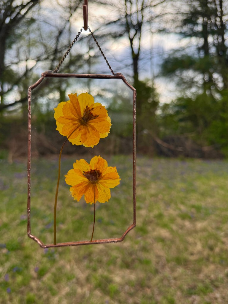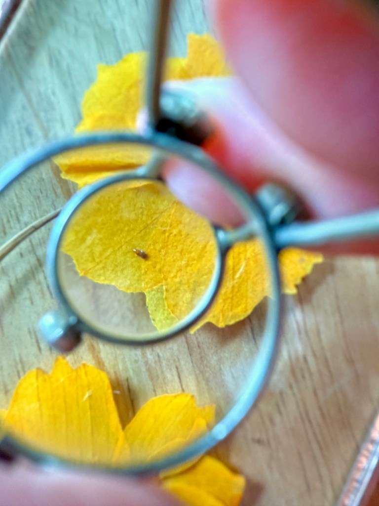 This piece got two specimens as I felt like went together. The upper flower ended up having a surprise on it that I chose to keep. Bing pressed on 28 July 2025, the petals have held a very tiny beetle this whole time (which is now preserved). You can see it as a small dot at about 7 o’clock on the lower portion of the petal. I imagine it had been in the center portion of the flower and I accidentally overlooked it but now it is part of the art piece. It is a reminder that these pieces are a snapshot of nature and an ecosystem that encompasses those we cannot see upon a quick glance.