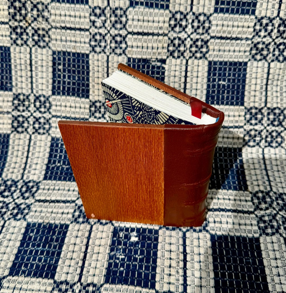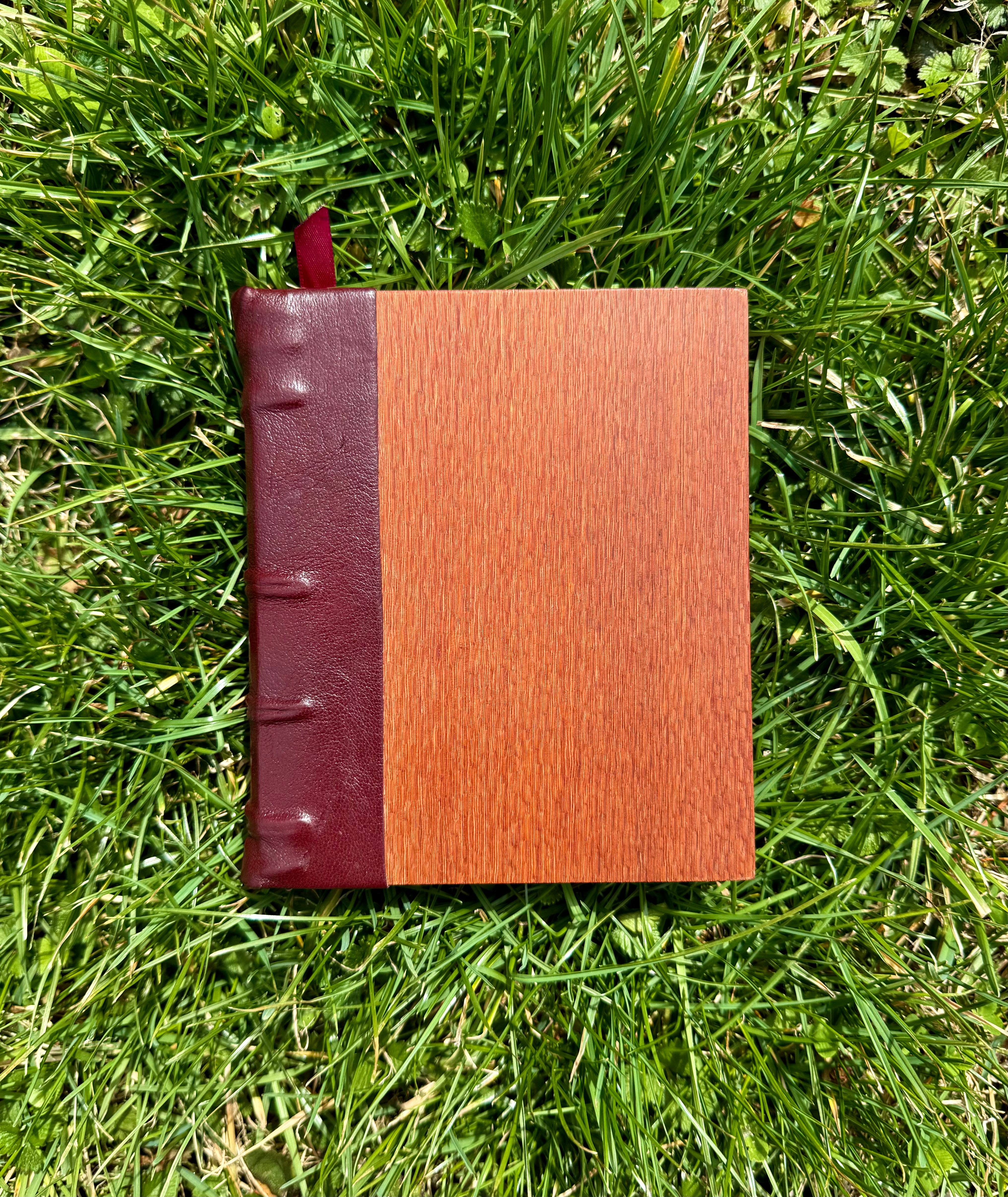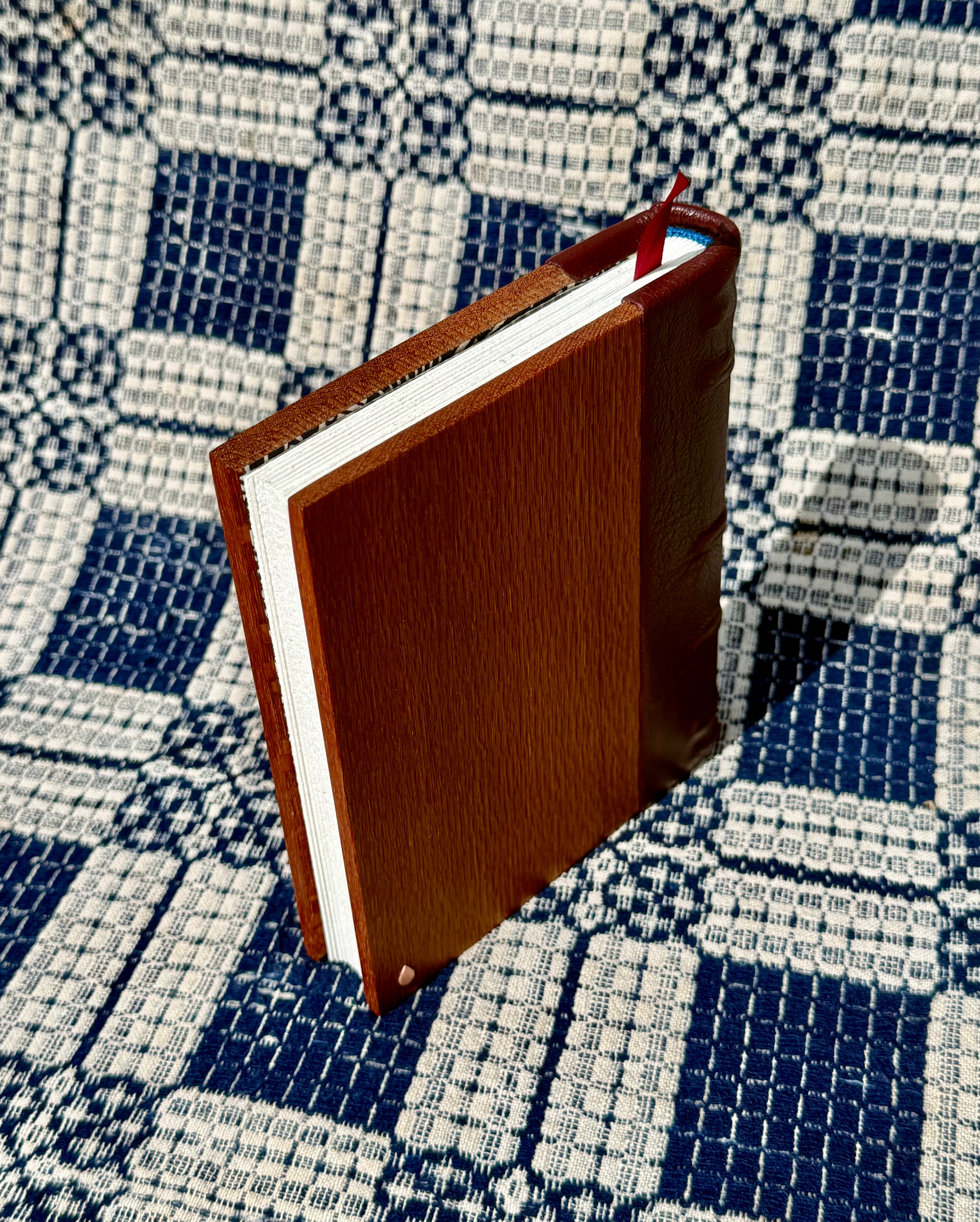 This book is a quarter bound leather book using hardwood covers made from protea wood and a rounded spine. The binding is performed by sewing the signatures onto hemp cords, which are then inserted into the covers.