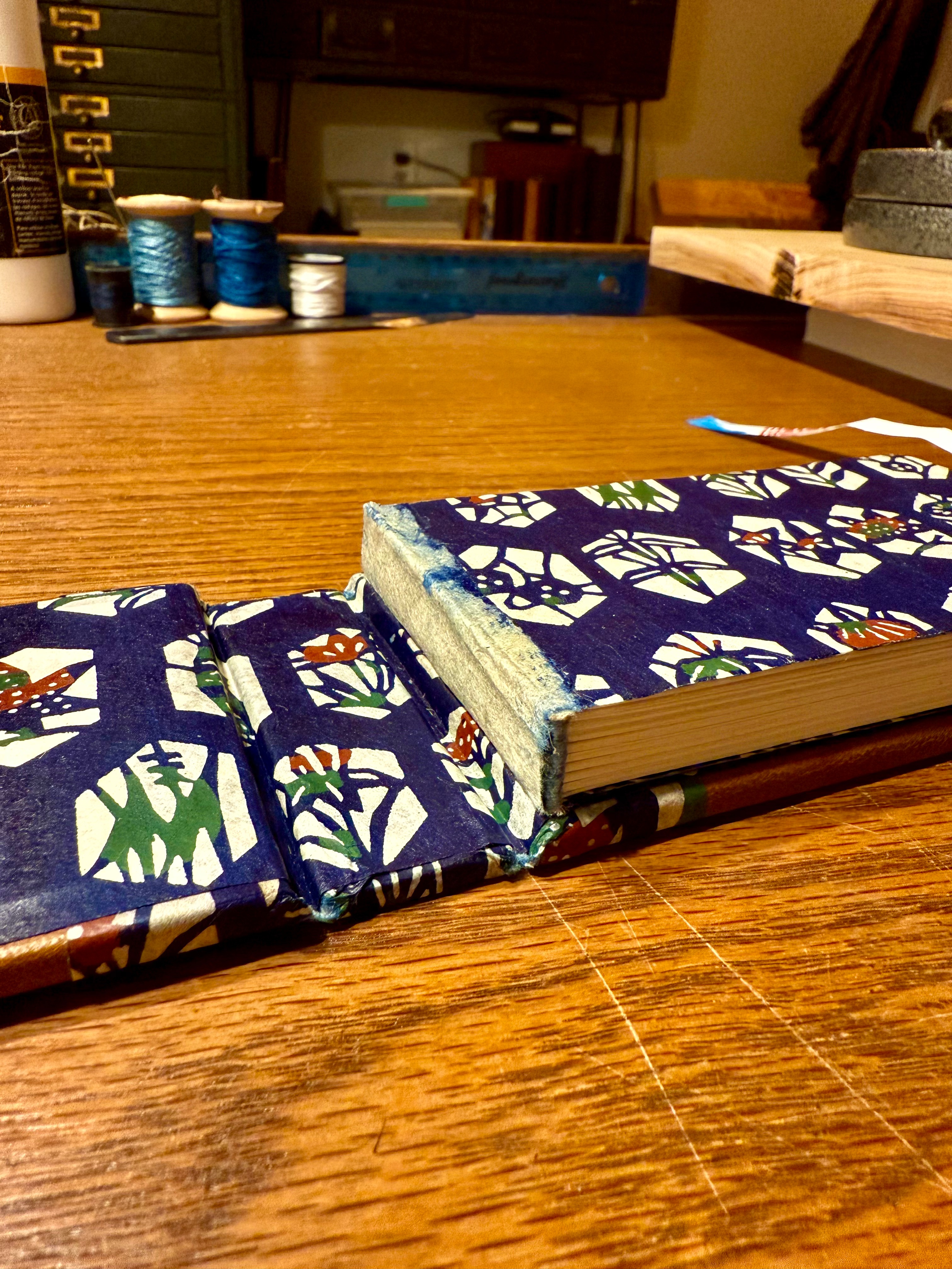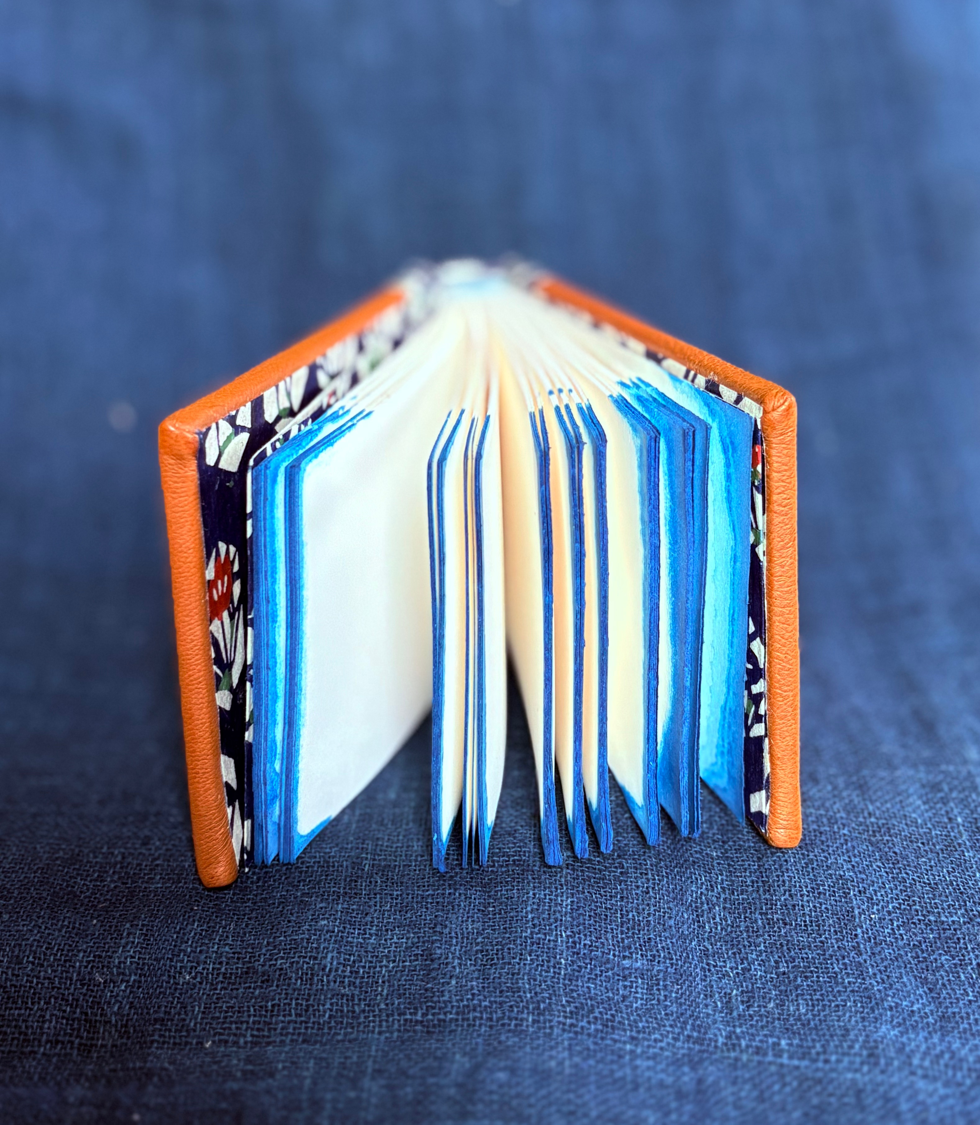 The binding contains a headband and tailband sewn in with indigo-dyed silk (using the plant). The fore edge is dip-dyed using a blend of indigo and bright blue ink (as a fun experiment).