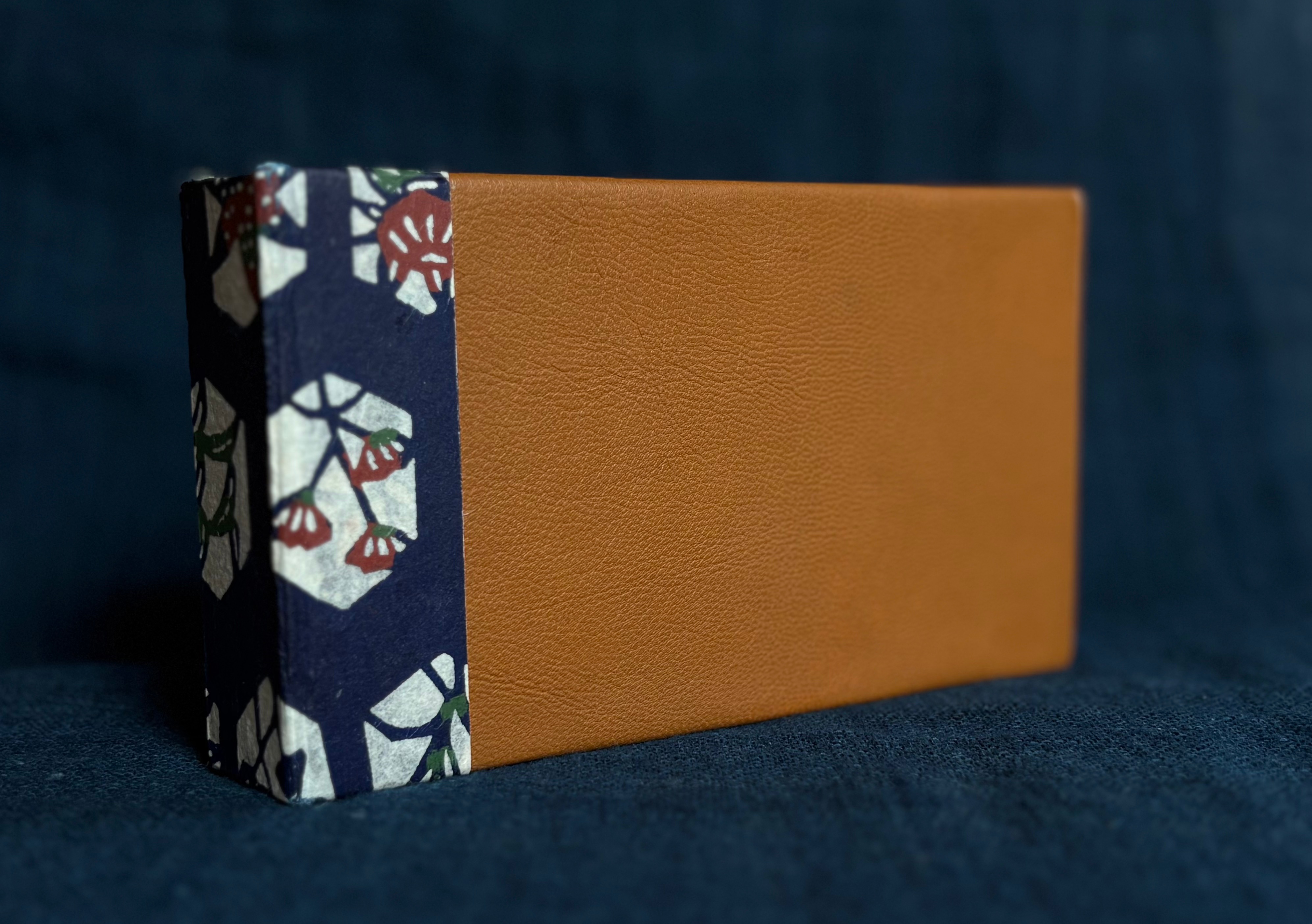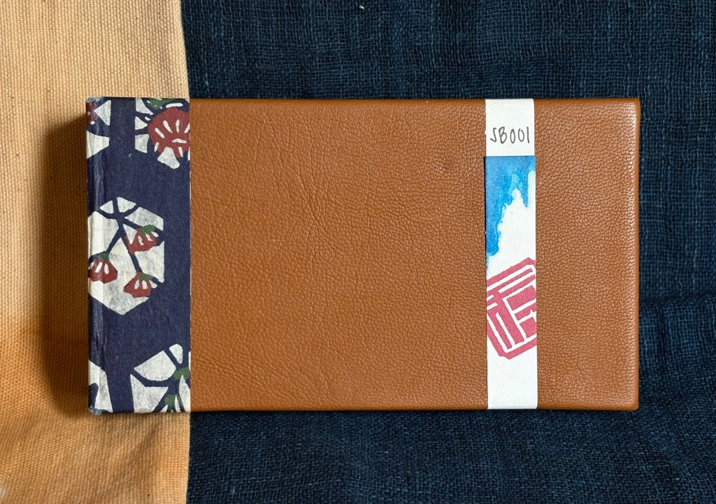 I chose to make this one as a small notebook or flip-back sketch book using goat leather, hand-printed washi, and cut-offs from larger book signatures.